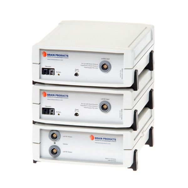 The 32 channel units can be stacked to expand the number of channels up to 256 and combined with the BrainAmp ExG to record EOG, ECG, EMG and other peripheral signals such as GSR (Galvanic Skin Response), respiration, acceleration, temperature, etc.