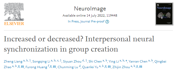 參考文獻:Zheng Liang, Songqing Li, Siyuan Zhou, Shi Chen, Ying Li, Yanran Chen, Qingbai Zhao, Furong Huang, Chunming Lu, Quanlei Yu, Zhijin Zhou,Increased or decreased? Interpersonal neural synchronization in group creation,NeuroImage,2022,119448,ISSN 1053-8119,https://doi.org/10.1016/j.neuroimage.2022.119448.