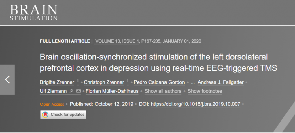 參考文獻:Zrenner, B. ,  Zrenner, C. ,  Gordon, P. C. ,  Belardinelli, P. , & F Müller-Dahlhaus. (2019). Brain oscillation-synchronized stimulation of the left dorsolateral prefrontal cortex in depression using real-time eeg-triggered tms. Brain Stimulation, 13(1).