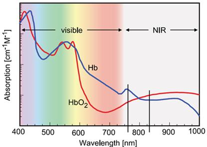 圖 1-3 氧合血紅蛋白和脫氧血紅蛋白對(duì)不同波長(zhǎng)光的吸收率
