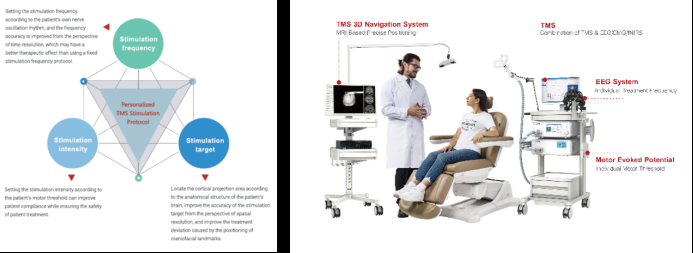 盡管rTMS 獲得了FDA,以及許多國內國際臨床指南、專家共識的推薦,但由于在皮層興奮性水平、神經振蕩節律以及解剖結構等方面存在個體差異,導致使用傳統TMS 治療方案的效果因人而異,部分患者不能響應rTMS 治療,癥狀無法緩解。針對治療現狀深圳英智科技有限公司在全球首家推出了集成TMS、腦電記錄儀、MEP、TMS導航等技術,實現個體化定頻、定量和定位的個體化精準治療整體解決方案。