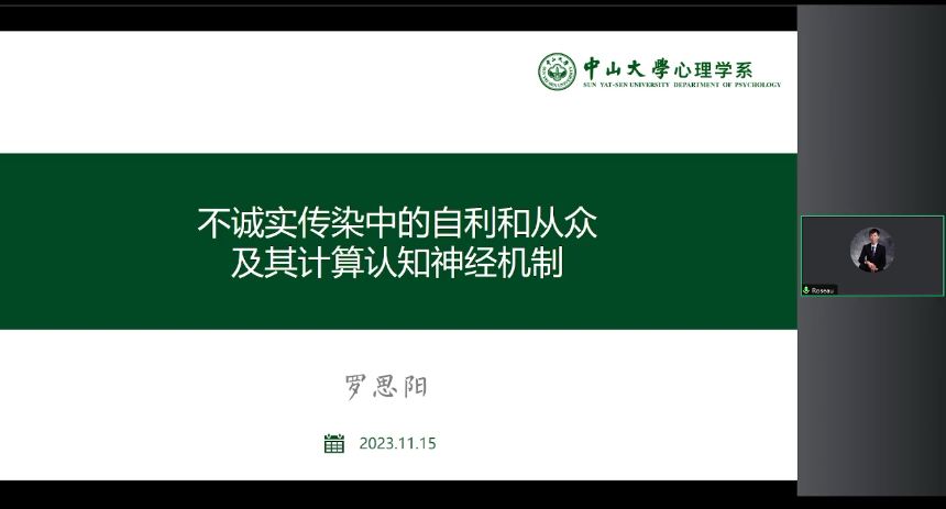 2023年11月15日晚20點(diǎn),中山大學(xué)心理學(xué)系副教授、博士生導(dǎo)師羅思陽(yáng)教授作為腦客中國(guó)科研第124位講者為大家?guī)?lái)主題為《不誠(chéng)實(shí)行為演化中的自利和從眾及其計(jì)算神經(jīng)機(jī)制》的報(bào)告。