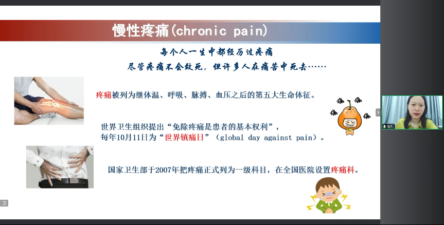 疼痛也被列為繼體溫、呼吸、脈搏、血壓之后的第五大生命體征。每年的10月11號被世界衛(wèi)生組織列為世界鎮(zhèn)痛日。我們國家衛(wèi)生部2007年在韓繼生院士的推動下,在全國各個醫(yī)院都設立了疼痛科。