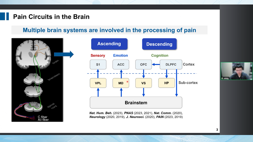 在過去5年,我們課題組就系統(tǒng)性的研究了疼痛,特別是人類疼痛的神經(jīng)網(wǎng)絡(luò)表征。我們關(guān)注了疼痛的上行和下行傳導(dǎo)的兩條通路。在上行傳導(dǎo)通路里面我們關(guān)注的是丘腦皮層的通路,丘腦是感覺信號上行傳導(dǎo)的中繼站,他負(fù)責(zé)將上行傳導(dǎo)信號投射到大腦皮層上。我們發(fā)現(xiàn)丘腦通過投射不同核團(tuán)到不同的腦區(qū)處理多種疼痛信息。而在下行調(diào)控方面,我們關(guān)注認(rèn)知因素怎么通過影響前額葉腦區(qū),然后投射到皮層下的區(qū)域,進(jìn)而影響疼痛的感受。