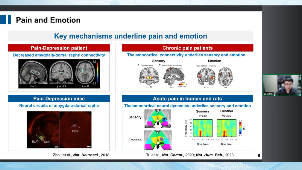 我們自己團(tuán)隊的研究也是在慢性疼痛、急性疼痛誘發(fā)人類被試和大鼠上去研究了丘腦皮層的神經(jīng)活動怎么樣來參與處理感覺和情緒信息。我們就發(fā)現(xiàn)它是有不同的丘腦皮層連接和神經(jīng)活動來參與處理疼痛這兩個維度的信息。