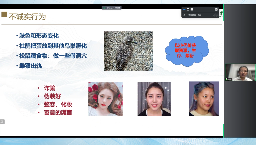 在人類社會還有很多別的情況,比如說詐騙、偽裝好,就是自己沒那么好說自己好,還有化妝、整容以及善意的謊言等。在不誠實行為里,我根據這個人對事情本身的意識水平高低進行排序,從高到低依次是回憶不道德行為、作弊、欺騙、撒謊、社會贊許以及自我欺騙。 自我欺騙是一種你自己意識不到自己在撒謊的一種情況。