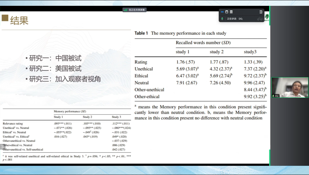 我們總共做了三個研究,分別是選取的中國被試,美國被試以及加入觀察者視角?;趯嶒灲Y果我們進行了迷你云分析,得到的結論是非道德行為和道德行為均會損害對后續材料的記憶,但前者的影響會更大。