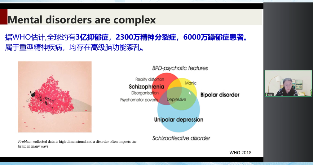 我本人首先是信息工科的背景,非常希望能夠把我們先進的計算學習技術應用到精神疾病的客觀診斷上來。根據國際健康組織WHO統計顯示,全球目前是約有3億的抑郁癥,2300萬精神分裂癥,以及6000萬的躁郁癥患者。這些重型精神疾病患者都存在高級的腦功能紊亂,同時在臨床表征上會非常的接近,這也給臨床依據癥狀來進行的診斷帶來了相當大的挑戰。