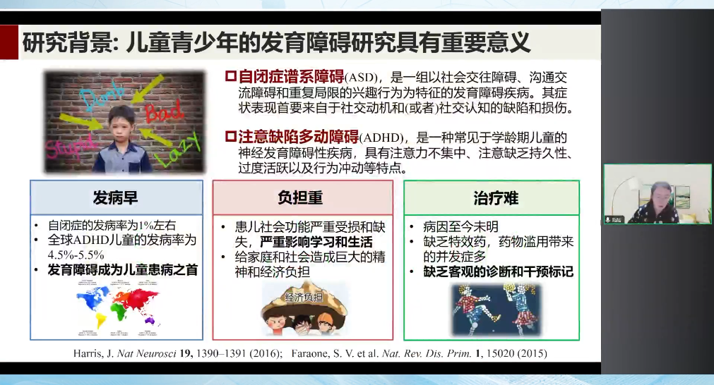 除了我們剛才說到的重型精神疾病。目前我們可以知道很多精神疾病,它的首發期都是在兒童青少年階段。同時兒童青少年廣泛存在的精神障礙,包括自閉癥譜系障礙和注意缺陷多動障礙。這個也是我們團隊主要關心的兩個方式。它主要是存在一些發病早,給家庭帶來的負擔重,同時治療比較困難的問題。