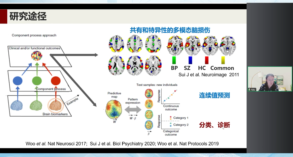我本人所做的這個方向主要是多模態的磁共振融合計算。我們是希望通過研發一些多元協同分析的方法,能夠發現不同模態之間隱含的,但有可能卻是關鍵的交互影響,從而更全面的刻畫精神疾病的復雜性。