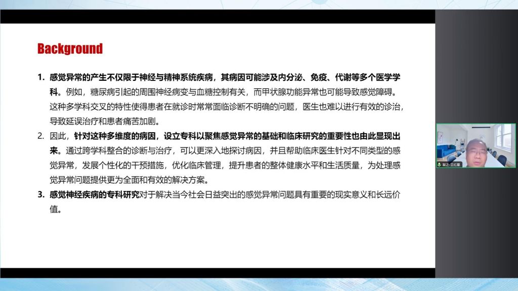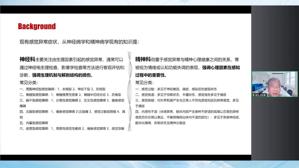 今天晚上的報(bào)告主題是我們過(guò)去至少十年,臨床實(shí)踐后思考再臨床實(shí)踐,不斷總結(jié)歸納出的可能能夠?yàn)榛颊呓鉀Q痛苦等這一類(lèi)感覺(jué)異常疾病的感覺(jué)神經(jīng)病學(xué)。關(guān)于感覺(jué)神經(jīng)病學(xué),我們的思考和想法,現(xiàn)在就開(kāi)始向大家介紹。