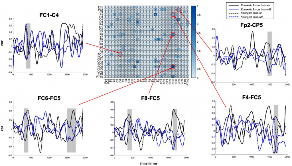 FC1-C4 在TP7顯示出在情侶中接觸條件下的功能連接大于不接觸條件,而在陌生人中不接觸條件下的功能連接大于接觸條件。