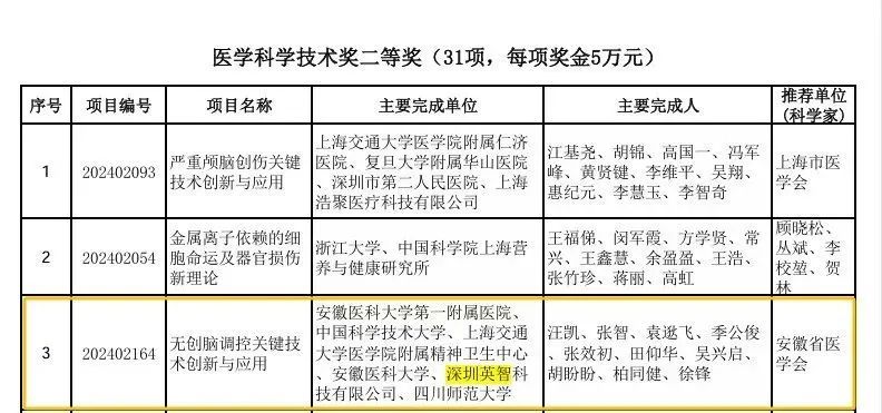 2025年1月6日,中華醫(yī)學(xué)會(huì)科技評(píng)審部公布2024年中華醫(yī)學(xué)科技獎(jiǎng)獲獎(jiǎng)項(xiàng)目。其中深圳英智科技有限公司安徽醫(yī)科大學(xué)第一附屬醫(yī)院、中國科學(xué)技術(shù)大學(xué)、上海交通大學(xué)醫(yī)學(xué)院附屬精神衛(wèi)生中心、安徽醫(yī)科大學(xué)、四川師范大學(xué)5大單位共同開展的“無創(chuàng)腦調(diào)控關(guān)鍵技術(shù)創(chuàng)新與應(yīng)用”項(xiàng)目獲評(píng)中華醫(yī)學(xué)科技獎(jiǎng)醫(yī)學(xué)科學(xué)技術(shù)獎(jiǎng)二等獎(jiǎng)。