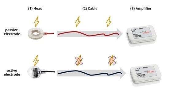 在傳統的被動電極技術中,我們可以將EEG電極(包括其線纜的整個長度)視為一個天線,它可以探測任何類型的電磁活動。在信號到達EEG放大器之前,EEG信號可能會與影響電極頭和線纜的電磁噪聲混合在一起,最終在EEG放大器處信號被轉換和放大(見圖1)。
