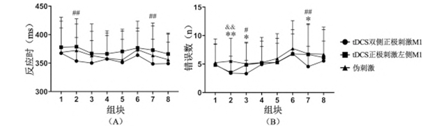 組塊2和組塊7的反應時在 tDCS 雙側正極刺激 M1 組低于 tDCS 正極刺激左側M1組(P=0.005,P=0.007)。見圖6A。
