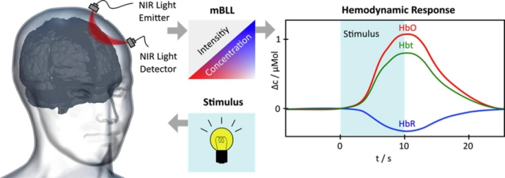 使用近紅外腦成像設備時,將光源、探測器置于頭部相應部位,光源發射的光進入組織或細胞,在歷經一系列吸收、散射事件后,仍會有一部分光子到達皮層表面,探測器可以接收到這些光信號。大腦活動時,神經元的代謝發生變化,導致局部區域的血流量增加,氧合血紅蛋白HbO的濃度相對升高,脫氧血紅蛋白HbR的濃度相對降低。這會引起近紅外光吸收的改變,被探測器到 。
