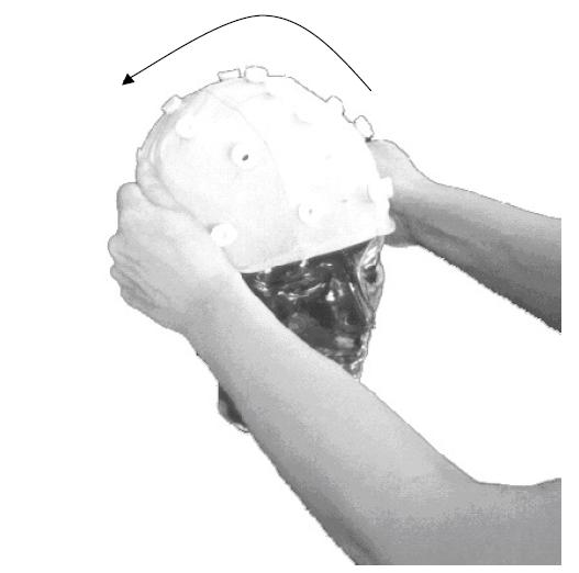 圖 1-1 帽子從前額開始逐漸套在頭上。被試可以協助在前額按住帽子,以更好更快的戴好帽子。然后確保, Cz 點在頭部的左右前后的中間位置,并確保側面的電極位置勻稱排布。