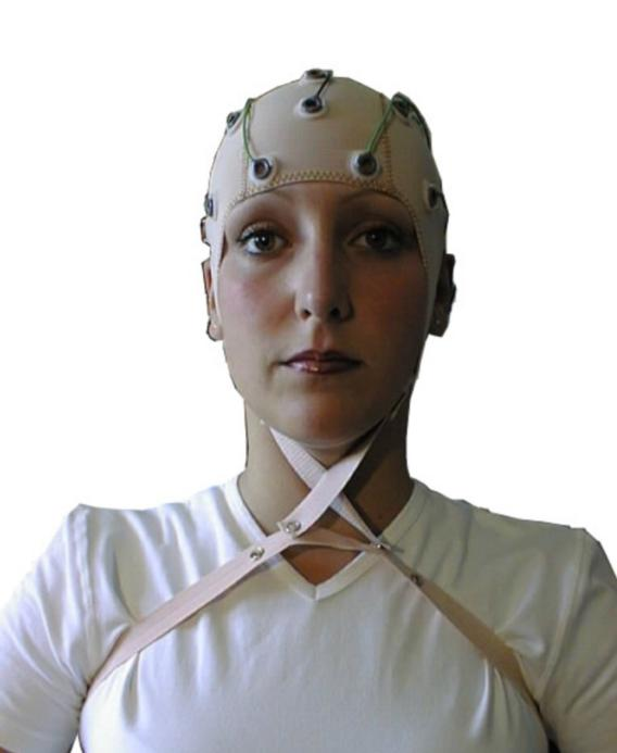 用胸帶(圖 1-2)或下頦帶(圖 1-3)來固定電極帽。在使用胸帶時,把下頦帶按下面的方式系上,并使較平滑的一面貼著皮膚。同樣的,也使胸帶較為柔軟的一面貼著皮膚。這兩種方法都要求使用最小的緊度。讓耳朵從縫隙里完全露出來,并使帽子能夠緊密的貼合耳后的皮膚,即貼合乳突位置。