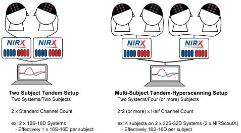 使用近紅外進(jìn)行超掃描測(cè)量,如下圖所示,不僅可以使用同一臺(tái)電腦進(jìn)行雙人的測(cè)量,還可以將設(shè)備串聯(lián)后,形成四人甚至多人在同一計(jì)算機(jī)上的測(cè)量,測(cè) 量方式的多樣化,為自然情境下不同被試的研究提供了便利。