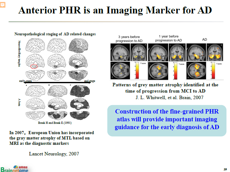 但旁海馬這個腦區,包括內側顳葉、腦皮質的萎縮可以用于輔助診斷AD。早在2007年,歐盟的指南里就已經提到了內側顳葉。旁海馬實際上只是內側顳葉的一小部分。