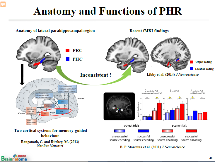以前的傳統是將旁海馬分成前層跟后層?;谇皩优院qR和后層旁海馬,又提出了一個所謂的記憶系統。跟前層旁海馬相連的那些腦區所構成的網絡叫前記憶系統;跟后層旁海馬相連的那些腦區所構成的網絡就叫后記憶系統。