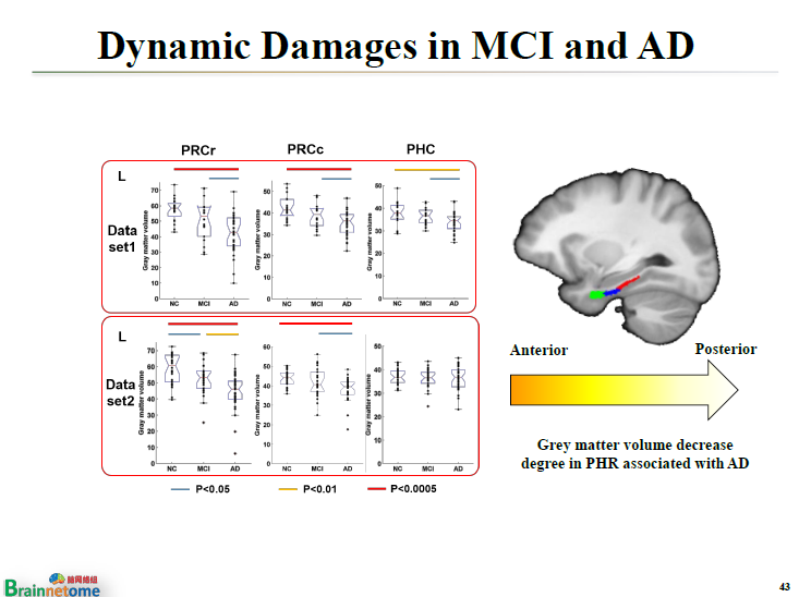 更重要的是,我們發現AD病人的旁海馬經歷了前、中、后這樣一個漸變的過程。在較早的時候,可能只有最前層開始萎縮,慢慢地往中間的過渡,等老年癡呆以后,整個旁海馬都開始萎縮了。