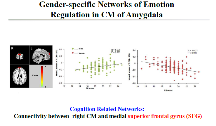 央內側核(C Mof Amygdala)和額上回(Superior frontal gyrus)的連接強度,跟情緒調節的分數做相關性分析以后,在男性里面呈現正相關,女性里面則呈現負相關。