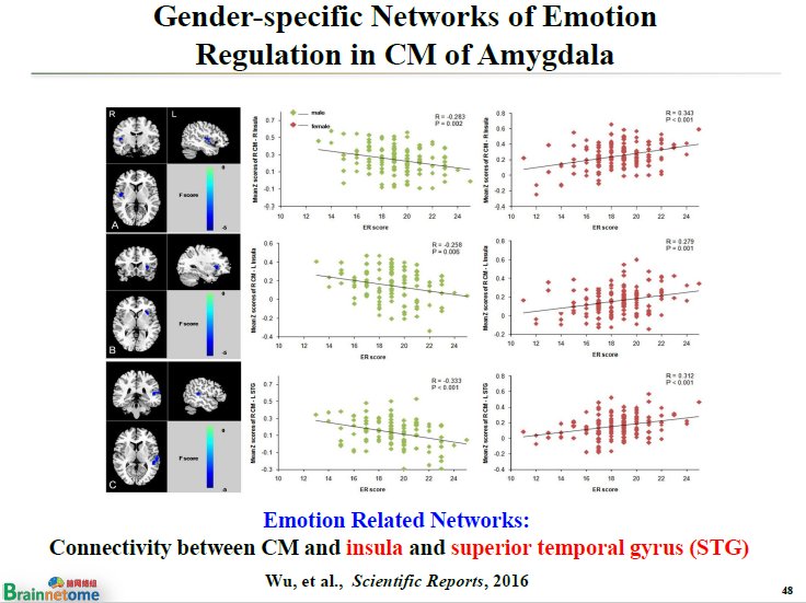 在這三個亞區上重復剛才的過程,即計算這三個亞區跟全腦的連接強度,再去跟情緒調節的分數做相關性分析,看女性和男性之間到底有沒有本質的區別。我們招募了三百多個大學生進行研究,發現了一個很有意思的現象。