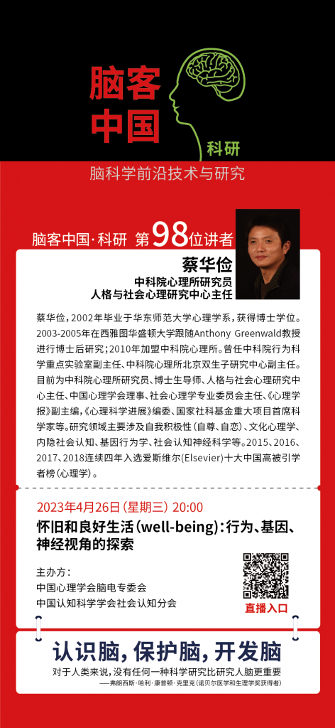 【直播預告】 本周三(4月26日)晚20點 蔡華儉:懷舊和良好生活(well-being):行為、基因、神經視角的探索