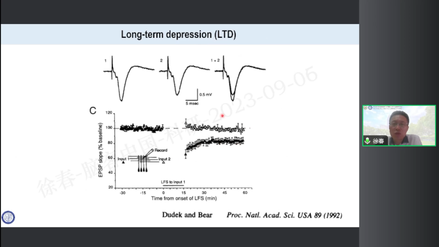如果突觸連接一味的增強,那可能到最后會變成超負荷,甚至整個系統變得不穩定。 所以大家都在想,應該也有一個減弱突觸連接的機制。1992年,Dudek and Bear用低頻刺激一段時間后,發現被刺激的通路反應變弱了,而另外一個沒有經過低頻刺激的通路維持的很好。 這就是LTD的概念。