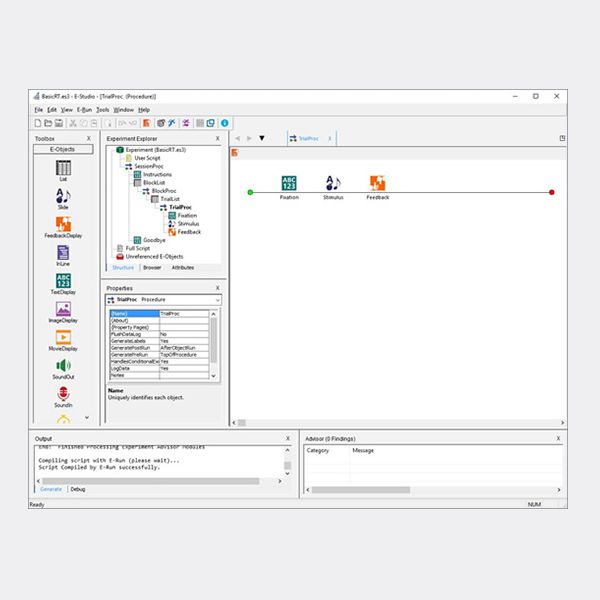 E-Run實(shí)時(shí)生成實(shí)驗(yàn)程序 只要在E-Studio中自定義完實(shí)驗(yàn)程序,就可通過鼠標(biāo)點(diǎn)擊將實(shí)驗(yàn)直接編譯成E-Basic腳本語言。通過編譯后,你就可呈現(xiàn)時(shí)間精確度達(dá)到毫秒級的刺激,及獲得同步的行為數(shù)據(jù)。