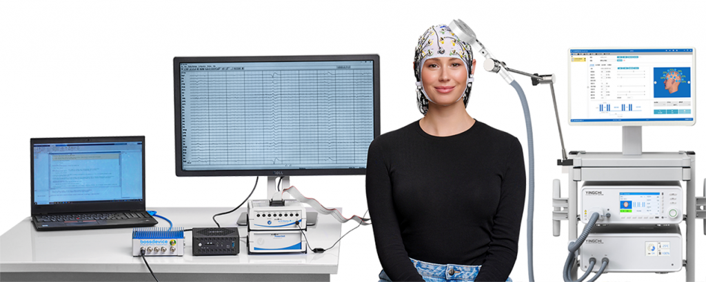 在腦電與近紅外結合的基礎上,使用TMS兼容的腦電帽、腦電電極和近紅外光源及探測器,就能達到在TMS刺激下的腦電與近紅外數據采集和研究。英智提供了完整的TMS解決方案,包括探頭穩定裝置和固定帽,使信號更加的穩定。